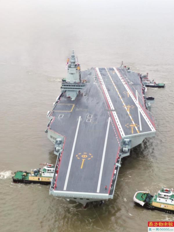 2024年5月1日8时许,我国第三艘航空母舰福建舰从上海江南造船厂码头解缆启航,赴相关海域开展首次航行试验。这是拖船正在将福建舰拖离码头。 新华社发