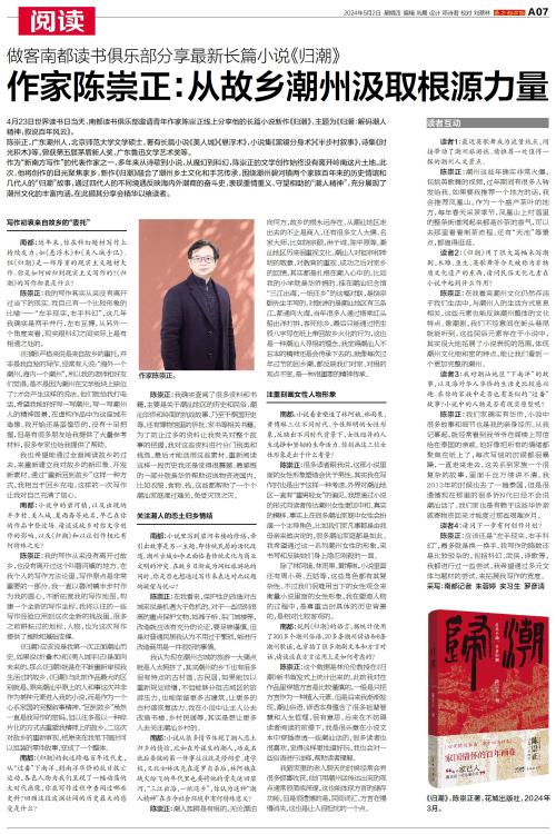 4月23日世界读书日当天,南都读书俱乐部邀请青年作家陈崇正线上分享他的长篇小说新作《归潮》,主题为《归潮:解码潮人精神,叙说百年风云》。