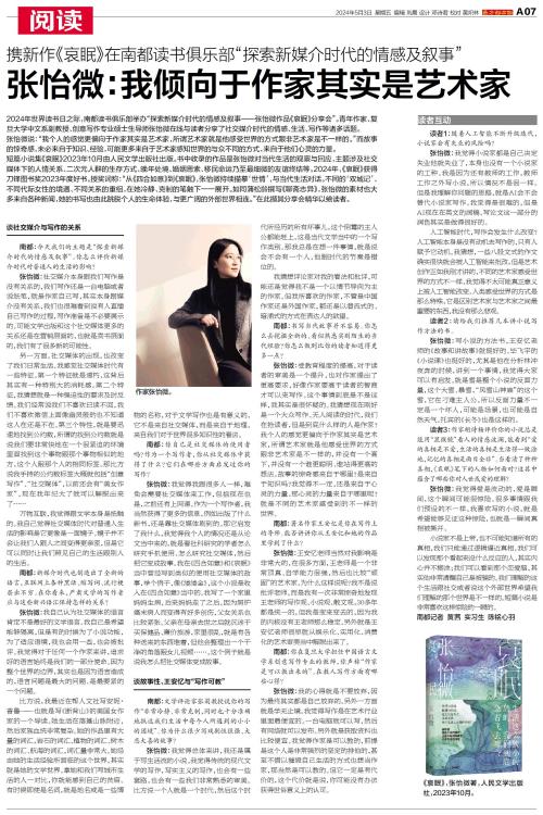 2024年世界读书日之际,南都读书俱乐部举办“探索新媒介时代的情感及叙事——张怡微作品《哀眠》分享会”。青年作家、复旦大学中文系副教授、创意写作专业硕士生导师张怡微在线与读者分享了社交媒介时代的情感、生活、写作等诸多话题。