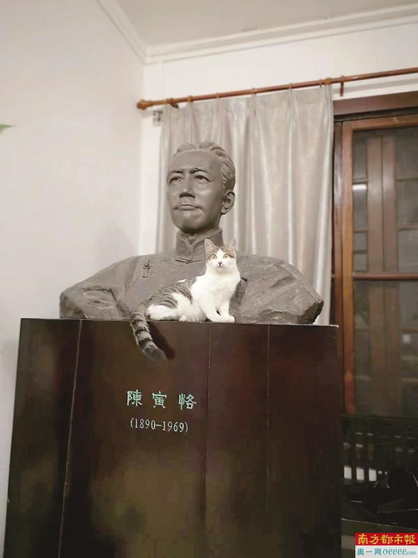 小猫默默与陈寅恪铜像。