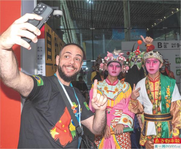 第135届广交会第三期首日,一名境外采购商与来自普宁的英歌舞表演者合影。本届广交会于5月5日在广州闭幕。 南都记者 黎湛均 张志韬 摄