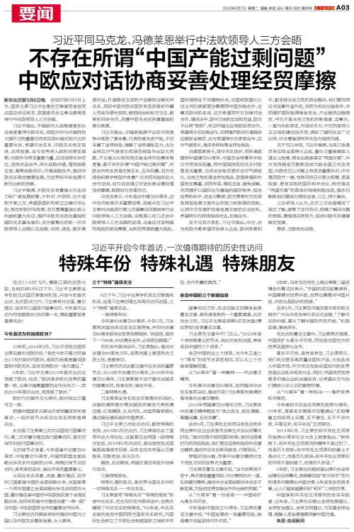 当地时间5月6日上午,国家主席习近平应邀在巴黎爱丽舍宫同法国总统马克龙、欧盟委员会主席冯德莱恩举行中法欧领导人三方会晤。