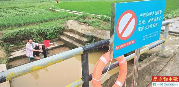 附近村民无视宣传标语在供水渠旁洗衣。 南都记者 蔡肇宇 摄