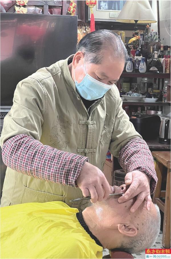 当天下午4时,60多岁的胡伯带着4岁的小孙子来剪发,一见面,两人便自然而然地寒暄起来,抱怨起最近的回南天,整个楼道里全是水汽。胡伯向记者介绍,“小孙子从满月起就来这剪发,往前算,他太公就来这剪了。”不一会儿时间,又来了一位老街坊,指着自己3岁的小孙子说,“一放学,他就喜欢来这玩呀。”有小孩子的地方总是热闹,店里的气氛一下子就活跃起来了。