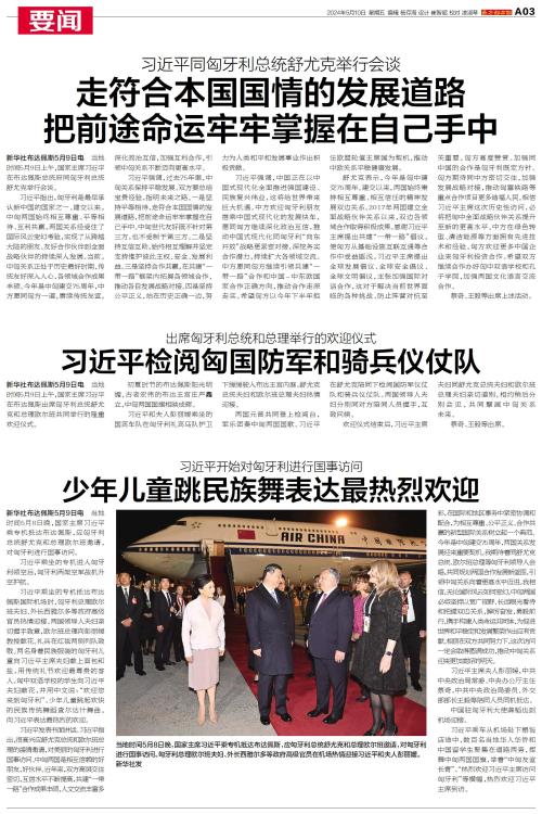 当地时间5月9日上午,国家主席习近平在布达佩斯出席匈牙利总统舒尤克和总理欧尔班共同举行的隆重欢迎仪式。