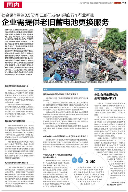 工业和信息化部、国家市场监督管理总局、国家消防救援局三部门印发《电动自行车行业规范条件》和《电动自行车行业规范公告管理办法》。