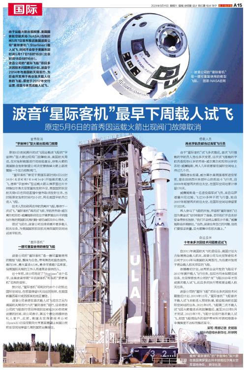 由于运载火箭出现故障,美国国家航空航天局(NASA)当地时间5月7日宣布推迟美国波音公司“星际客机”(Starliner)载人试飞,时间不会早于美国东部时间5月17日18时16分(北京时间18日6时1
