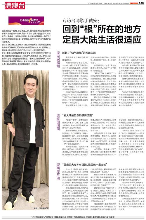 近日,南都、N视频记者专访了黄安,听他分享从年少歌手出道,到定居大陆后的生活。耳顺之年,黄安直言,常人梦寐以求的身外之物,自己都已得到满足,“老天对我很够意思”。两岸同胞都盼望家园和平安宁、家人和谐相处。他说,如今最后的心愿,是以乐观的心情,迎接祖国统一的到来。