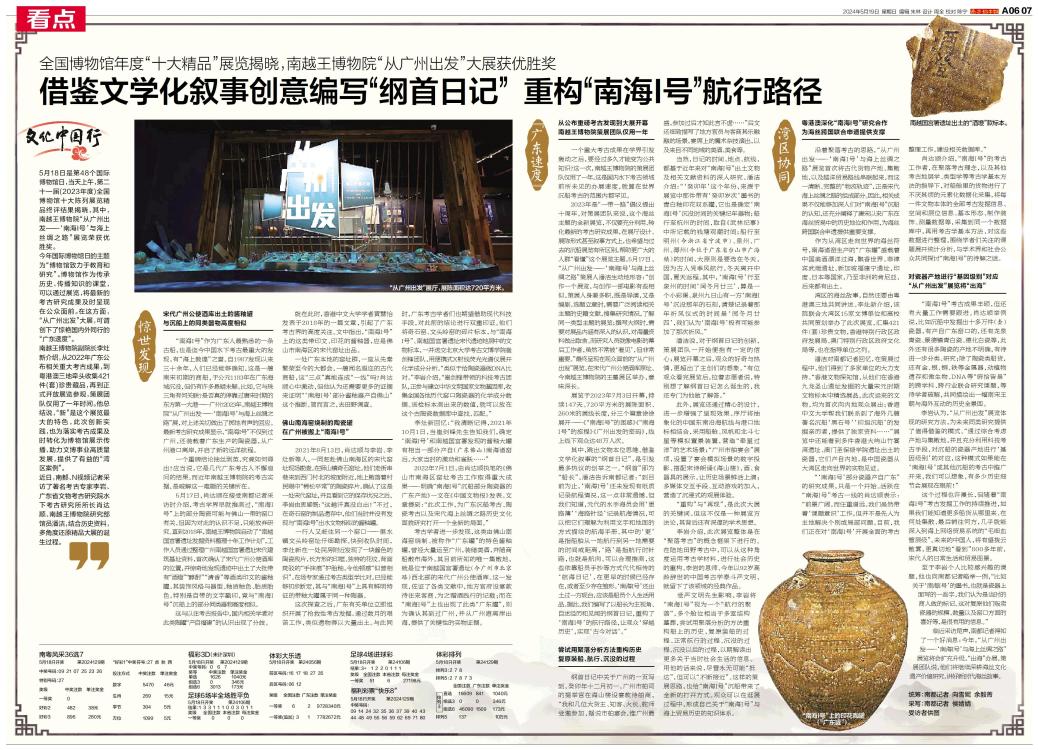 5月18日是第48个国际博物馆日,当天上午,第二十一届(2023年度)全国博物馆十大陈列展览精品终评结果揭晓,其中,南越王博物院“从广州出发——‘南海I号’与海上丝绸之路”展览荣获优胜奖。