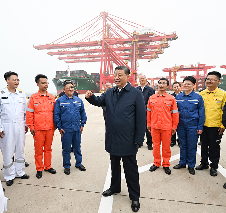 5月22日至24日,中共中央总书记、国家主席、中央军委主席习近平在山东考察。这是22日下午,习近平在日照港亲切慰问港口科技工作者、运营人员、航运人员。 新华社发