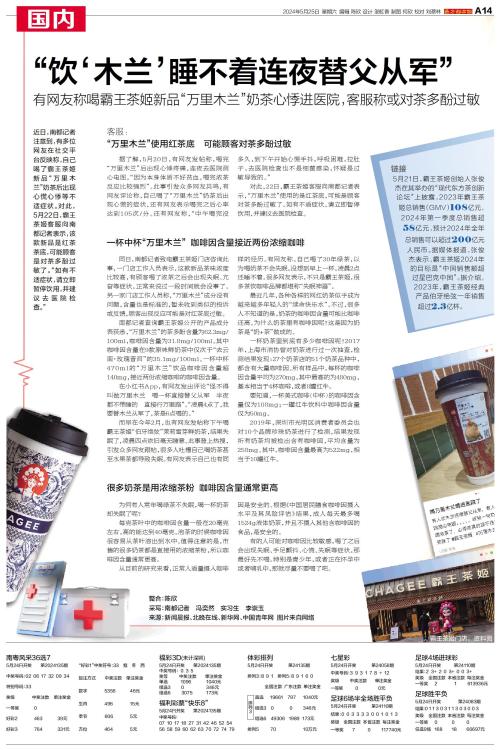 近日,南都记者注意到,有多位网友在社交平台反映称,自己喝了霸王茶姬新品“万里木兰”奶茶后出现心慌心悸等不适症状。