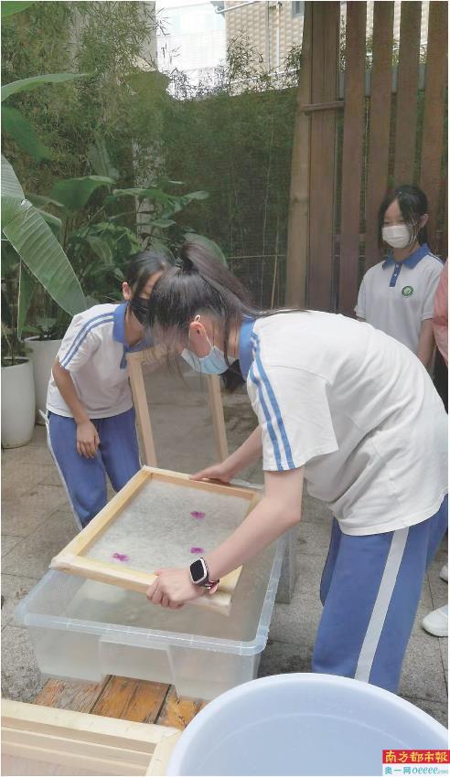 “先将筛选好的构树皮放到清水中浸泡,再捞出放到大锅里煮,等树皮纤维彻底软化了,再放到石缸里用石锤捣,使植物纤维变得更软更细,最后放到木槽里淘浆变成均匀的纸浆。纸浆生成后就开始抄纸,加入你喜欢的植物。最后把湿纸一张一张放在阳光下晾晒,完全晒干后,就会收获那份独一无二的花草纸。”趁着阳光正好,福田区纸艺特色项目主持人范荃仔细地向学生们讲解造纸流程。