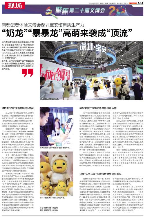 在宝安馆内,两位“门面担当”——高达2.1米的奶龙和1.7米的暴暴龙高萌来袭,这两个文博会上的“顶流”均来自第七印象文化传媒(以下简称“第七印象”)。“第七印象”自2017年成立以来,已成为宝安区内一家集动画、媒体、影视、线下美陈和游戏等多元化业务于一身的影视动漫领军企业。公司以IP内容为核心,成功孕育出“奶龙”“暴暴龙”和地球少年“小七”等多个备受喜爱的原创动漫IP。