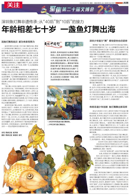 吴观球,是深圳盐田沙头角鱼灯舞的传承人;张谱,是深圳市盐田区外国语小学东和分校的学生。
