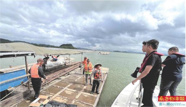 昨日,省海洋综合执法总队工作人员劝导渔排养殖人员上岸避险。 通讯员供图