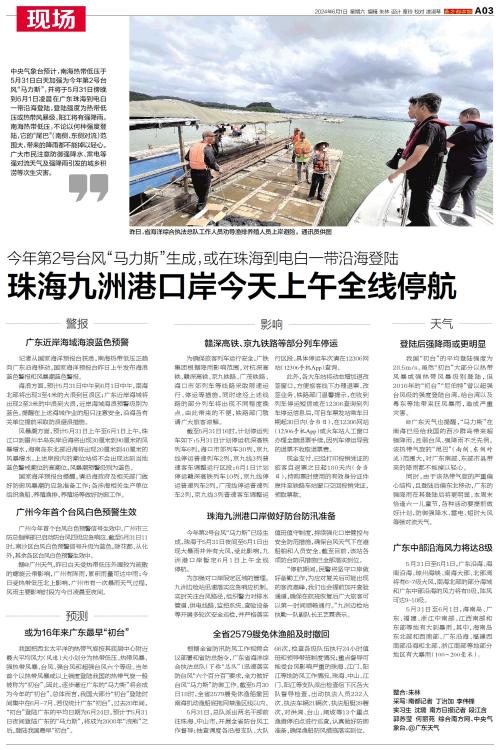 中央气象台预计,南海热带低压于5月31日白天加强为今年第2号台风“马力斯”,并将于5月31日傍晚到6月1日凌晨在广东珠海到电白一带沿海登陆,登陆强度为热带低压或热带风暴级,阳江将有强降雨。