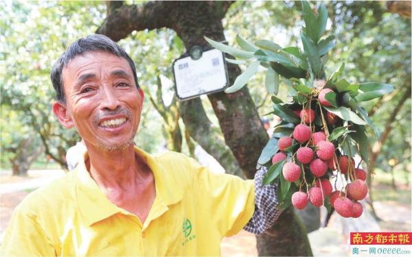 去年6月,在茂名高州根子镇柏桥村荔枝种植园,果农展示从树龄超千年的“天伦之乐”古树上采摘下的荔枝。 新华社发