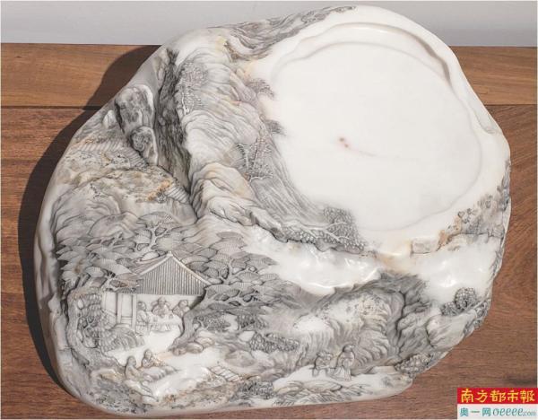 他留意到,白端通体色白如雪,结合中国传统水墨画,淡淡勾勒后,仿佛一方山水之景呈现眼前,目前该风格独树一帜于当前的端砚行业中。