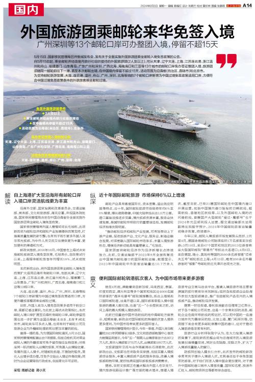 5月15日,国家移民管理局召开新闻发布会,发布关于全面实施外国旅游团乘坐邮轮入境免签政策的公告。