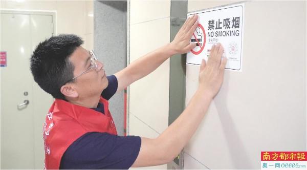 2024年5月27日至5月31日,深圳市控烟办在全市组织开展控烟督查。图为此次控烟督察直播中,控烟志愿者在张贴禁烟标识。南都记者 霍建斌 摄