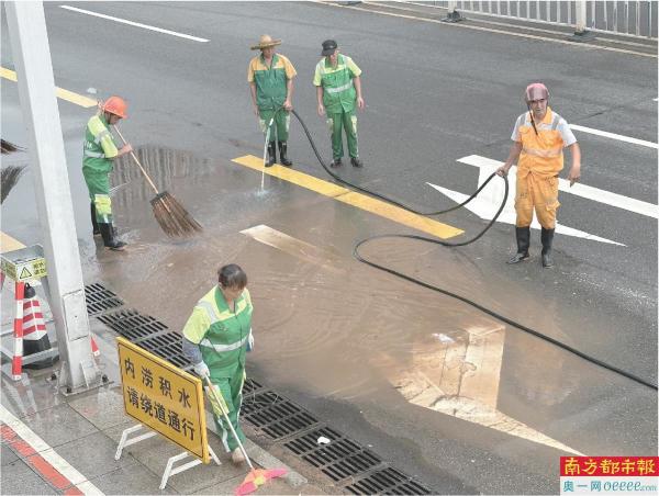 6月3日暴雨后,莞城环卫工人在清理路面淤泥和杂物。