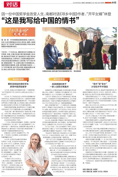 1983年,一个20岁出头、兼职清洁杂工的美国小伙布莱恩·林登,在雇主的家中首次看到地图上的中国,那时他还不知道,这个遥远的东方大国,将会如何改变他的命运。40多年后,已定居云南喜洲多年、并成为知名酒店品牌创办人的林登,写下《寻乡中国:林登的故事》一书,记录自己数十年来跨越文化、情感深厚的中国故事。近期,他回到妻子的故乡——江门开平塘口镇,举行《寻乡中国:林登的故事》分享会。他说,这本书正是一封写给中国的“情书”。