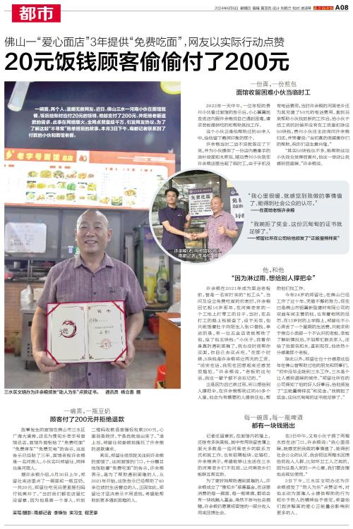 一碗面,两个人,温暖无数网友。近日,佛山三水一河南小伙在面馆就餐,饭后结账时应付20元的饭钱,他却支付了200元,并拒绝老板退款的请求,此事在网络爆火,全网点赞量超千万,引发网友热议。