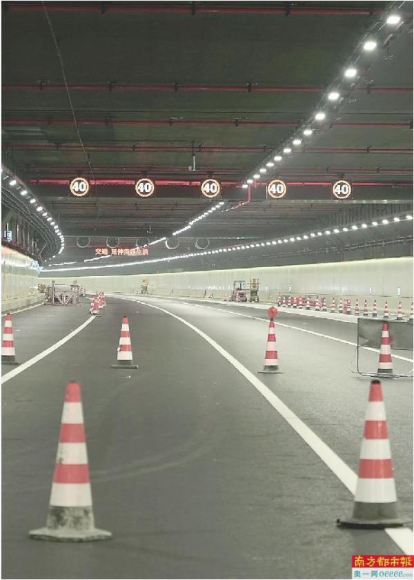 沿着西人工岛主线部分继续东行即进入长6845米的深中隧道,目前,隧道内灯光照明、可变情报板、交通标识,以及智能巡检机器人等智能交通管控设施已安装完毕。