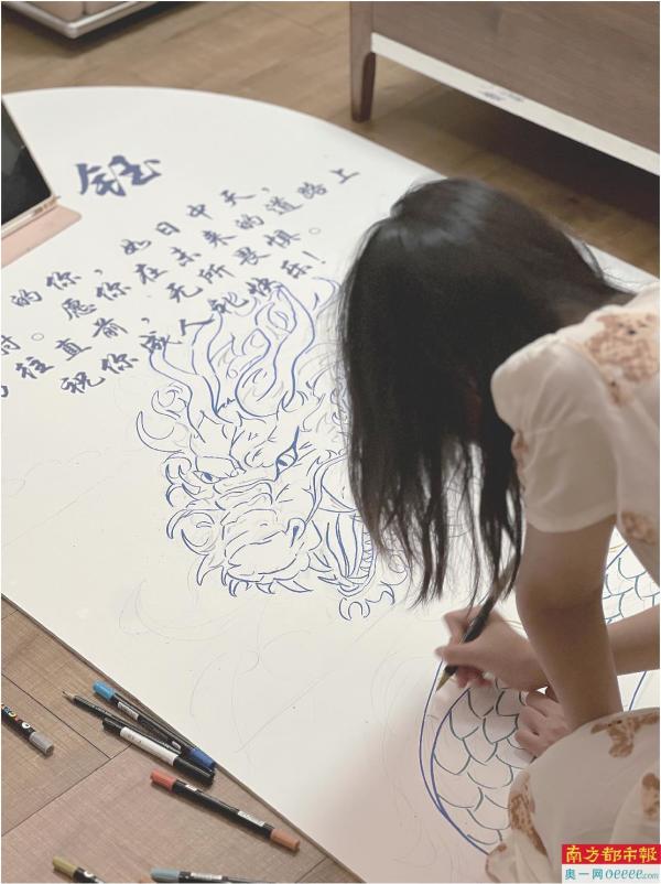 陈美曦正聚精会神为哥哥手绘两米巨龙。
