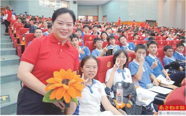 红岭中学老师们身穿红色衣服,手举向日葵,为学子们打气。