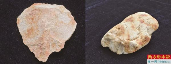 磨刀山遗址出土的打制石器“红土之心”(左)与砍砸器(右)。