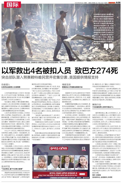 以色列8日在加沙地带中部努赛赖特难民营实施特种作战行动,救出4名被巴勒斯坦伊斯兰抵抗运动(哈马斯)去年10月7日袭击以色列时挟持到加沙的扣押人员。