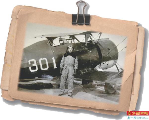 一张数十年前的黑白照片中,一名身着套装、头戴飞行帽的年轻人身姿笔挺,站立在一架标有号码“301”的飞机前,神情严肃。