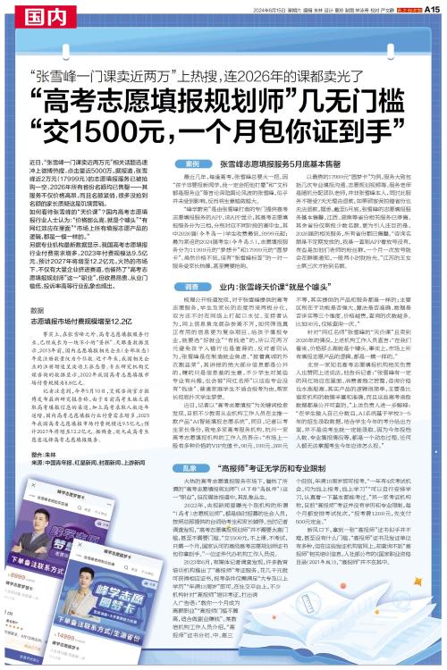 如何看待张雪峰的“天价课”?国内高考志愿填报行业人士认为:“价格那么高,就是个噱头”“有网红效应在里面”“市场上所有填报志愿产品的逻辑,都是一模一样的。”