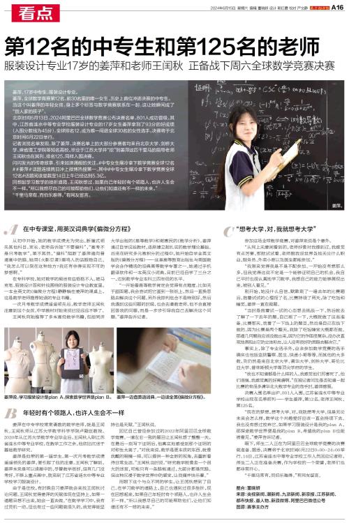 姜萍,全球数学竞赛第12名,前30名里的唯一女生,历史上首位冲进决赛的中专生。