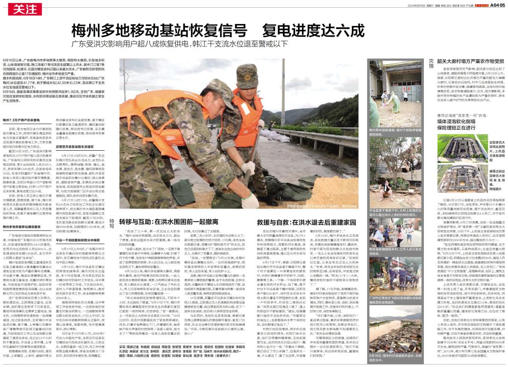 广东电信方面告诉南都湾财社记者,中国电信广东梅州分公司闻汛而动,应急通信指挥团队24小时值班,在两天内出动抢修人员近600人、应急通信抢修车辆108台次,全力守护人民群众通信“生命线”。