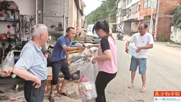 蕉岭县新铺镇矮车村,工作人员分发生活物资。