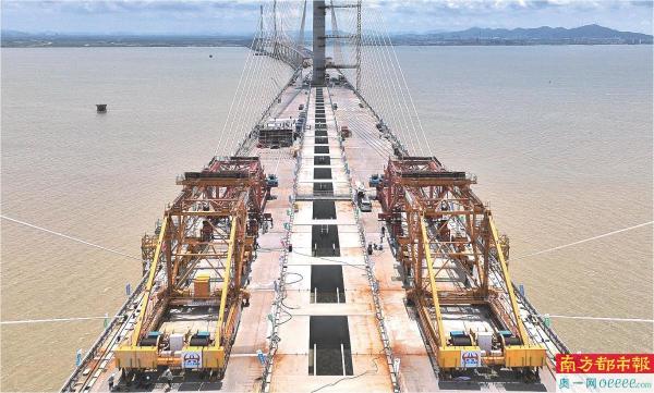 黄茅海大桥跨越黄茅海海域的两条航道,采用3塔2跨的独特设计,是一座采用独柱式双索面全漂浮体系的斜拉桥,由中铁大桥局、保利长大、中铁宝桥共同承建。大桥单孔跨径达到720米,桥梁全长2200米。全桥共计16种梁段类型,149个梁段,最重钢箱梁达420吨。