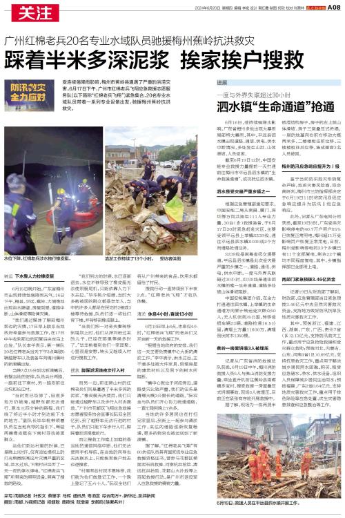 6月17日下午,广州市红棉老兵飞翔应急救援志愿服务队(以下简称“红棉老兵飞翔”)紧急集合,20名专业水域队员带着一系列专业设备出发,驰援梅州蕉岭抗洪救灾。