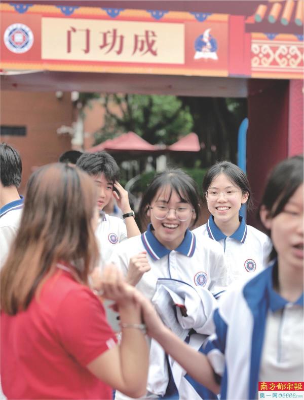 6月9日高考结束。广州培正中学考场外,考生和老师欢呼庆祝。 南都记者 钟锐钧 摄