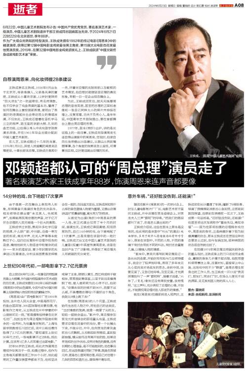 中国共产党优秀党员、著名表演艺术家、一级演员、中国儿童艺术剧院退休干部王铁成同志因病医治无效,于2024年6月21日22时22分在北京逝世,享年88岁。