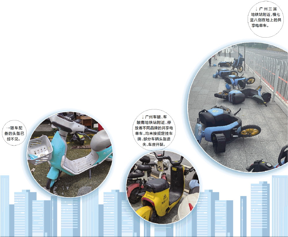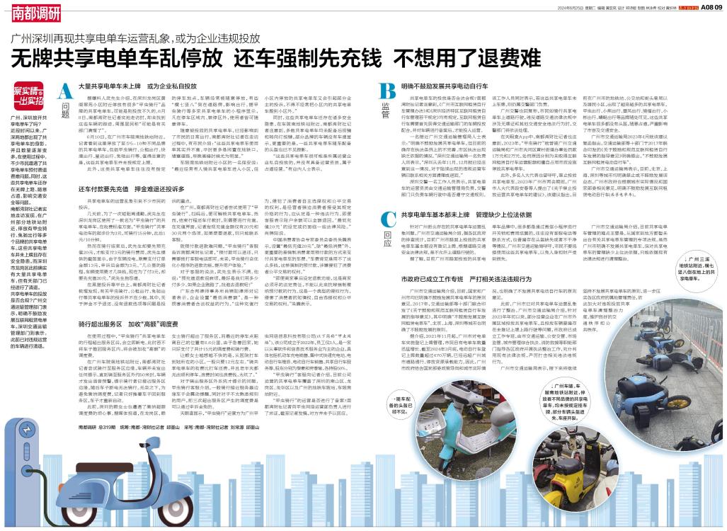 南都湾财社记者实地走访发现,在广州部分地铁站附近,停放有甲虫骑行、兔驰出行等多个品牌的共享电单车。这些共享电单车并未上牌且存在安全隐患。而深圳市龙岗区此前确实有大量共享电单车,但有关部门已经进行了清退。
