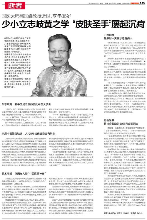 6月24日,南都记者从广东省中医院获悉,第二届国医大师、广东省中医院(广州中医药大学第二附属医院)原副院长禤国维于24日5时5分因病在广州逝世,享年86岁。