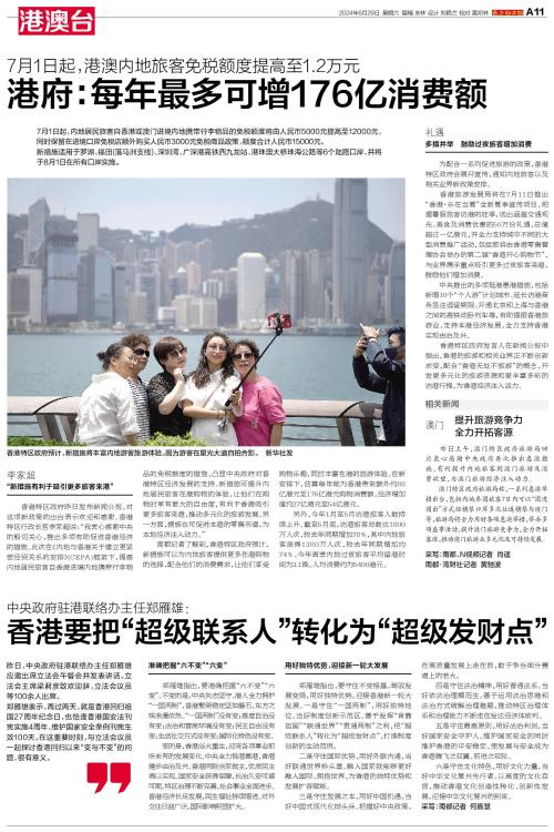 7月1日起,内地居民旅客自香港或澳门进境内地携带行李物品的免税额度将由人民币5000元提高至12000元,同时保留在进境口岸免税店额外购买人民币3000元免税商品政策,额度合计人民币15000元。