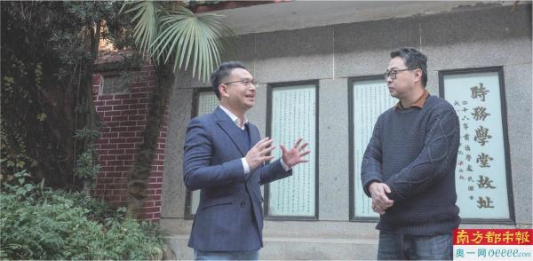 时务学堂研究会理事于鹏远(右)和郑焕坚在位于湖南长沙的时务学堂故址对谈。
