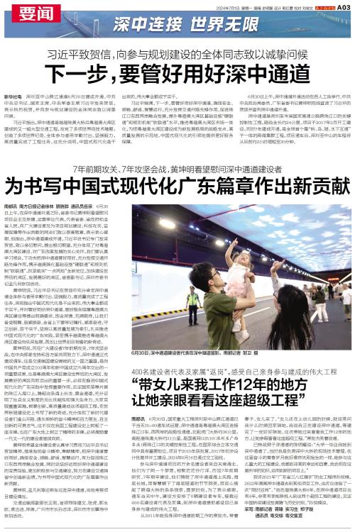 在深中通道开通之际,省委书记黄坤明看望慰问项目业主及参建、运营单位代表,代表省委、省政府和全省人民,向广大建设者及为项目规划建设、科技攻关、监理保障等作出贡献的同志们致以崇高敬意,表示衷心感谢。