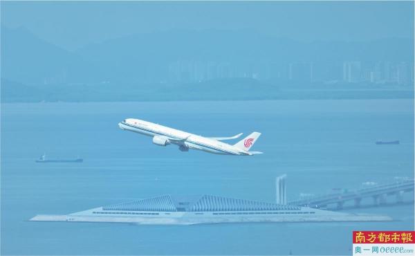 一架从宝安机场起飞的飞机正掠过深中通道。 通讯员供图