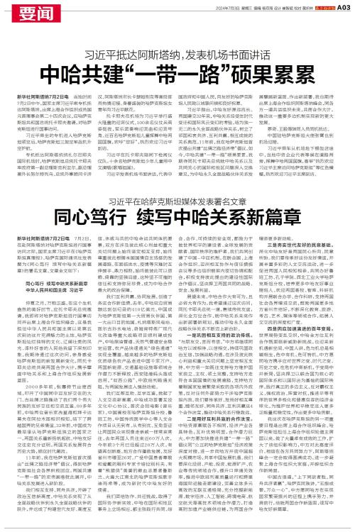 7月2日,在赴阿斯塔纳对哈萨克斯坦进行国事访问之际,国家主席习近平在《哈萨克斯坦真理报》、哈萨克国际通讯社发表题为《同心笃行 续写中哈关系新篇章》的署名文章。