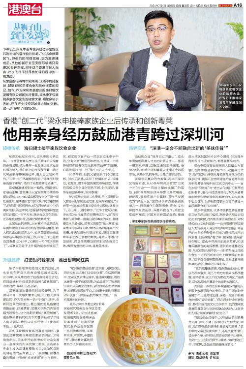 先跨出一步的梁永申希望更多的香港人能跟上大湾区融合的步伐。见证了深港融合发展20年历史的他坚信,深港一定会不断融合出新的“美味佳肴”。“现在很多行业在转型时,都把中国传统文化当作抓手,我的使命就是展现粤菜文化创新和融合的魅力,让更多的人通过美食读懂我们的文化。”