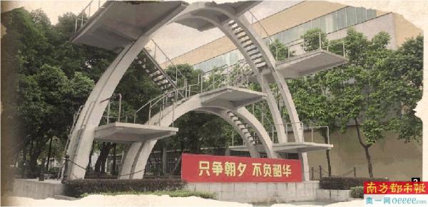 这个跳水台已成为二沙体育精神的象征之一,台下竖立着一则红色标语:只争朝夕,不负韶华。